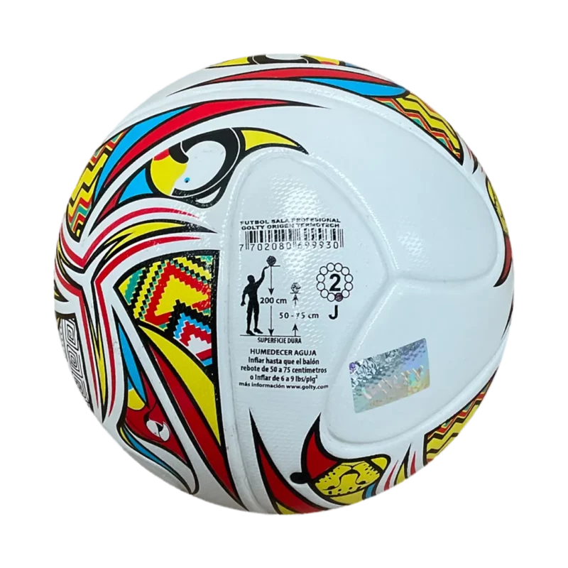 El balón de futbol sala golty profesional origen thermotech Cumple con especificaciones técnicas de la FCFS, su construcción con tecnología Thermotech genera perfecta esfericidad y ranuras entre los paneles termo-laminados además Posee Cámara de aire de butilo, recubierta con láminas de alta densidad entretejidas y cruzadas de igual manera agrega un tacto suave y consistente en todas las condiciones adicionalmente Incorpora Cubierta PU de alta calidad con triple refuerzo y Alta resistencia a la abrasión también posee Innovador diseño de paneles haciéndolo una joya con excelente simetría además al ser termo laminado se reduce al máximo la absorción de agua.